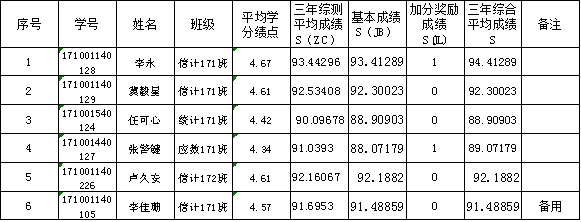 注:李佳珊为备选,李永在全国老员工数学竞赛(数学类)获得国家二等奖,综合成绩加一分;张警键在全国老员工数学竞赛(数学B类)获得国家二等奖,综合成绩加一分。